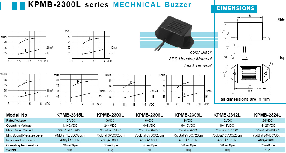 | 2300Hz | 9V | 85dB | 0,03A | í12x9.5mm | ||||||||||||||