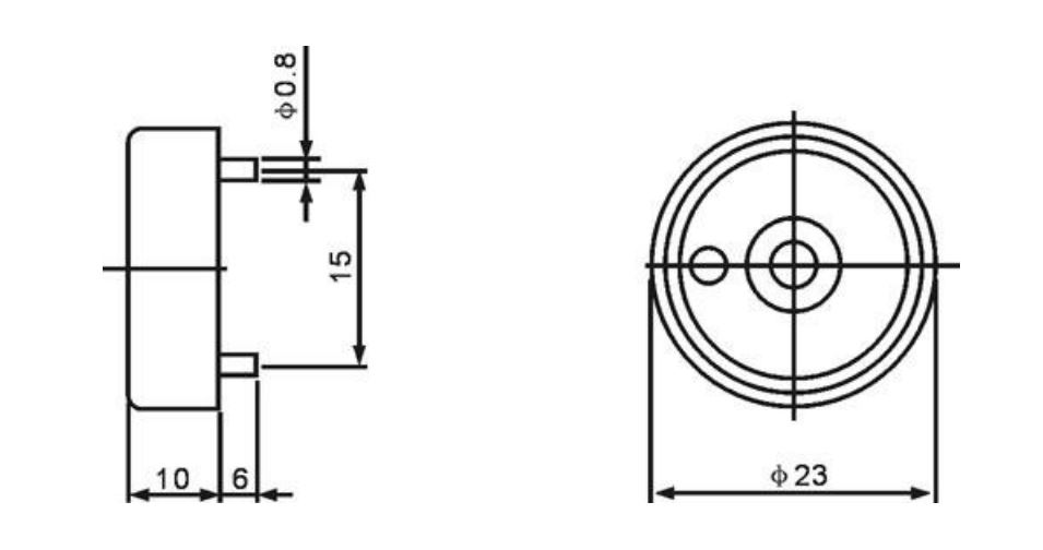 dimensions 23x16,4x14,4mm; voltage 6V; loudnes 75dB; current 25mA frequency 400Hz; with pins
