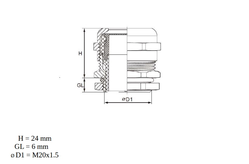 M20x1.5; clamping range: 10-14mm; silver color; H=24mm; GL=6mm; Temp range: -40°C...+100°C; material: Nickel-plated brass, PA (NYLON), UL 94 V-2;