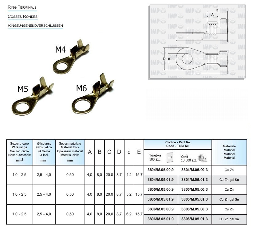 Ring | Not insulated | 1~2.5mm2 | Crimped | Brass | No colour (w/o insulation) | ||||||||||||||