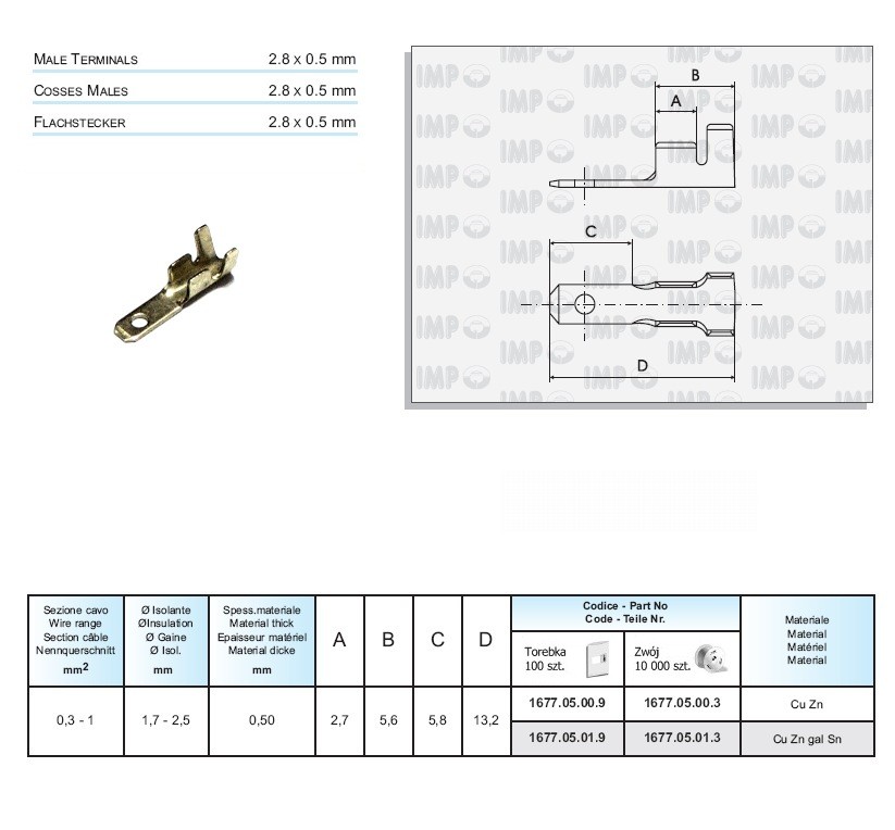 Flat | Not insulated | 0.3~1mm2 | Crimped | Brass | No colour (w/o insulation) | 2,8mm | 0,5mm | ||||||||||||