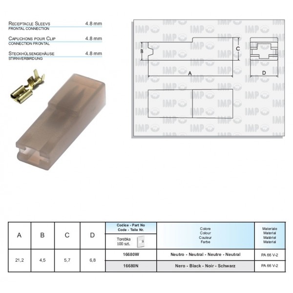 female; for push-on 4,8mm connectors; number of ways: 1; material: poliamid PA66 V-2, neutral color
