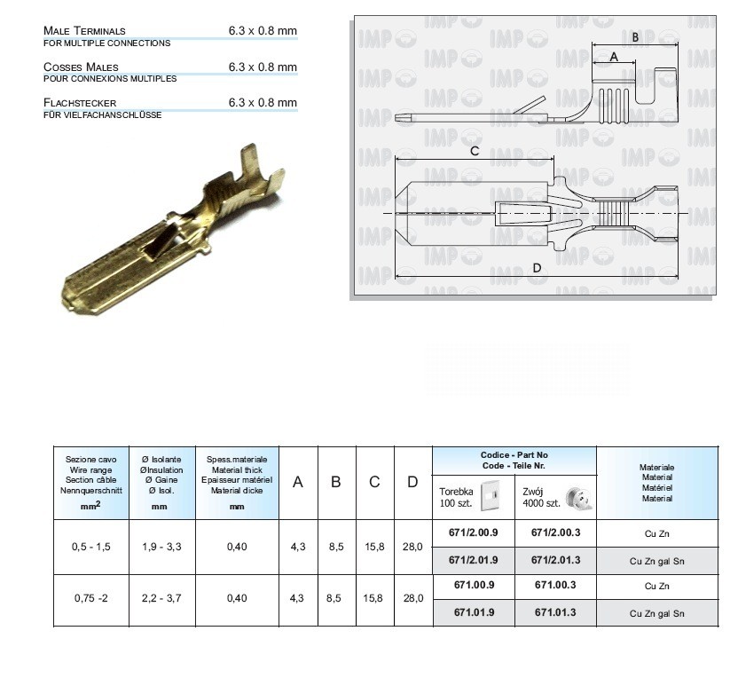 Flat | Not insulated | THT | Brass | No colour (w/o insulation) | 6,3mm | 0,8mm | |||||||||||||