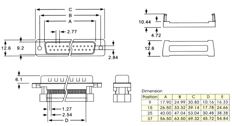 female; 37pin; for PCB; straight; through hole; w/o rivets and screws; metal housing; gold plated contacts, white insulator eqiv. DI37S-LF, DF37PP