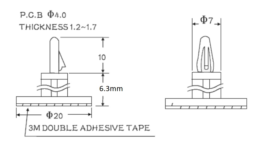 self-adhesive, spacer length: 6,3mm; plate mounting hole diameter: 4mm color: natural; material: Nylon66, eqiv. Wurth 709262000