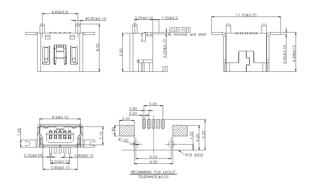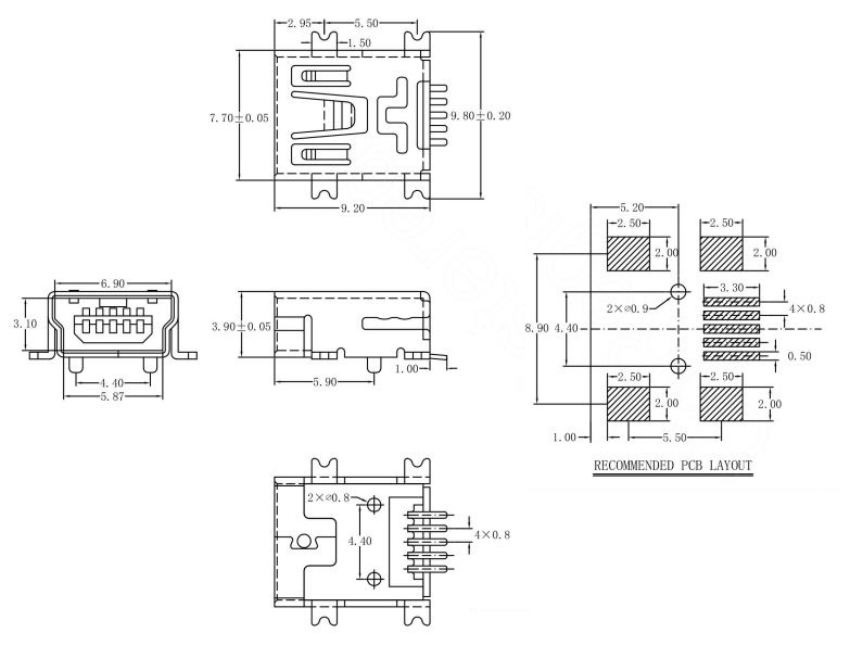 Socket | USB B mini | USB 2.0 | Vertical | SMD | 1A | 30V | ||||||||||||