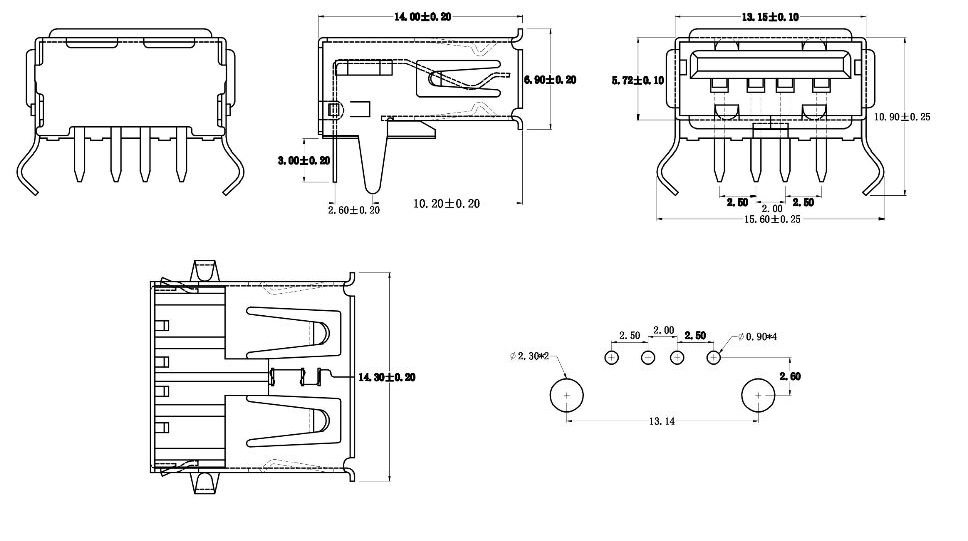 Socket | USB A | USB 2.0 | Horizontal | SMD | 1,5A | 30V | ||||||||||||