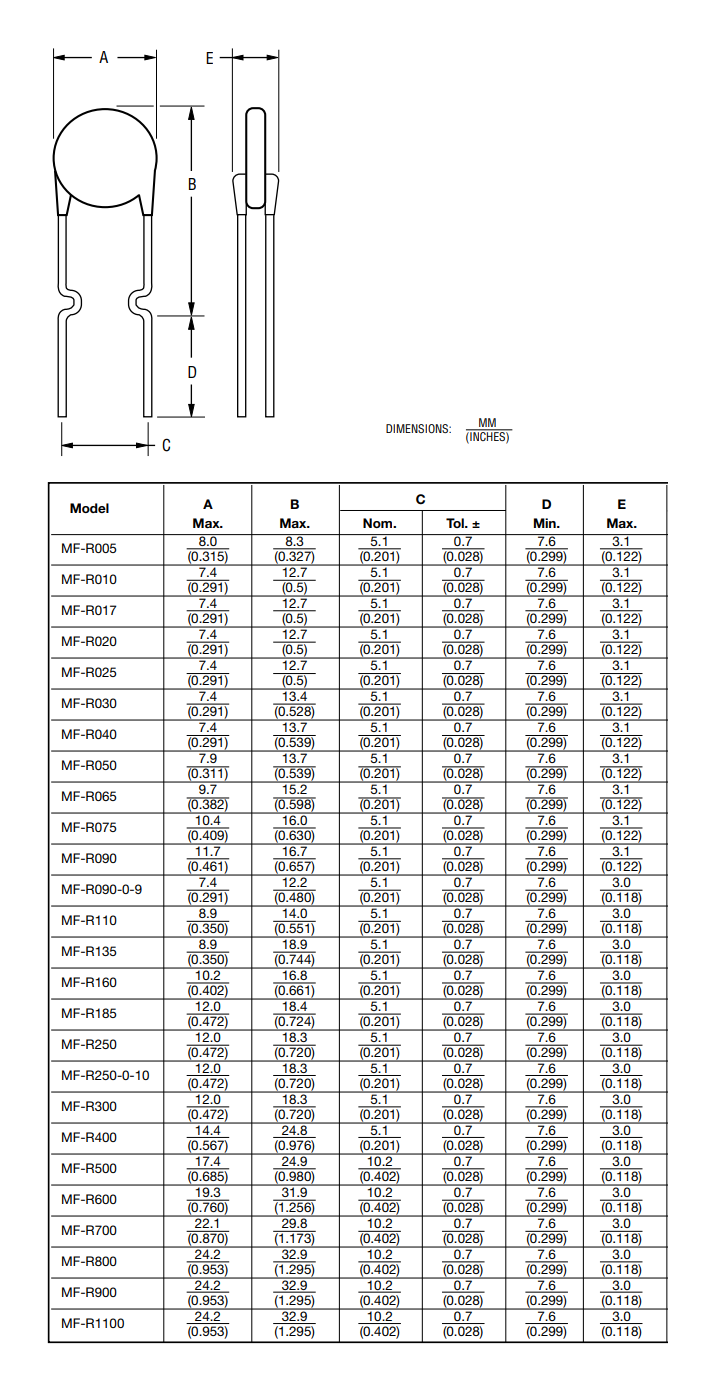 - Resettable polymer fuses, 0.10 A hold current