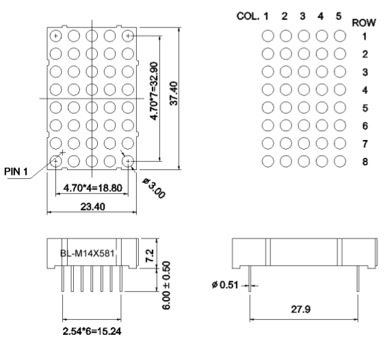 LED; 1.4" 5x8; red (645nm); luminosity: 120mcd; black surface IF=30mA; VF=2.5V; common cathode