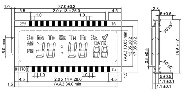 LCD clock display JH-019, 6 chars, size 37x17.85x2.8mm, viewing area 34x10.85mm green backlight, pin lenght 5 mm, temp. range -20°C up to +70°C