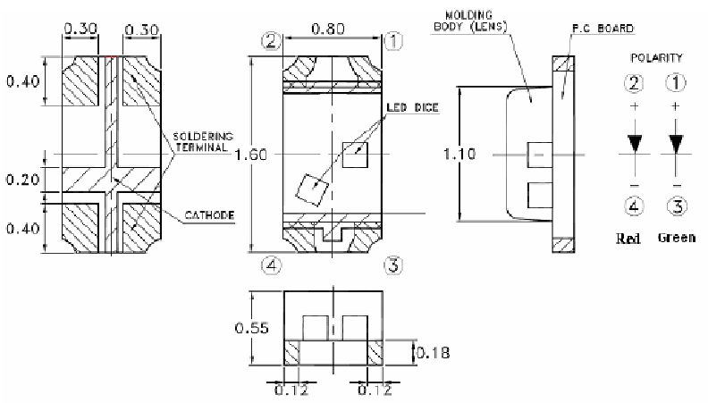 LED SMD 0603 (1608); RGB(625/525/470nm);luminosity 60/160/70mcd;waterclear viewing angle 120°; IF=30mA; VF=2.0/2.6/2.8V