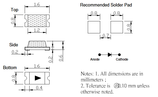 LED SMD 0402 red; luminosity: 120-220mcd; diode current: 30mA Wavelenght: 630-645nm; viewing angle: 120°; operating voltage: 1,95-2,5V