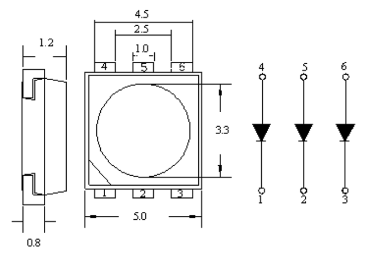 LED RGB PLCC6 (5050); dimensions: 5x5,4x1,65mm; luminosity: 480mcd/1500mcd/320mcd Wavelenght: 620nm ~ 630nm/515nm ~ 525nm/465nm ~ 475nm; operating voltage: 3,7-5,3V; refresh rate: 2kHz