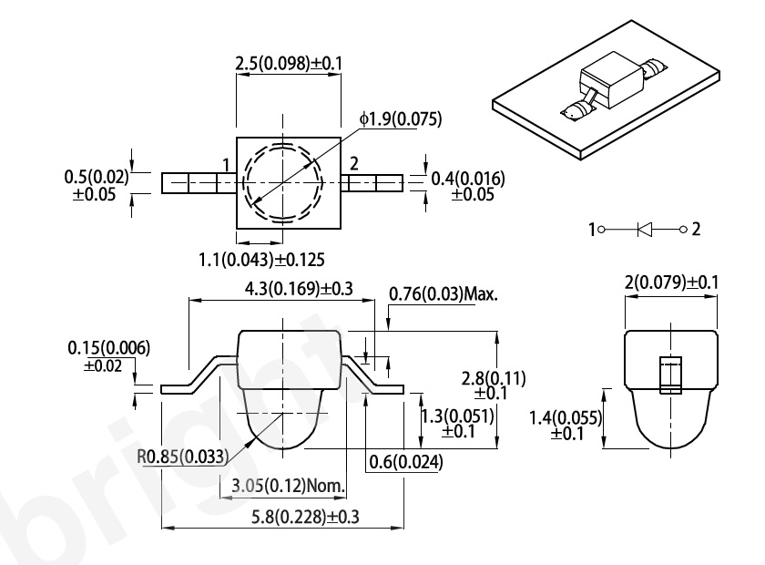 | Red | 200mcd ~ 430mcd | 630nm | 20mA | 120° | 1,95V ~ 2,5V | -40°C ~ 85°C | ||||||||||||