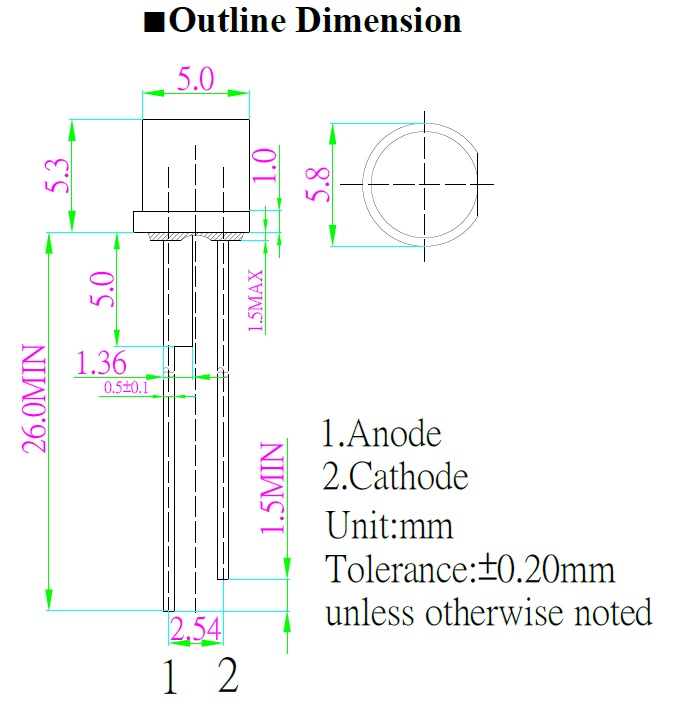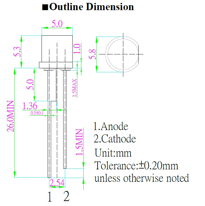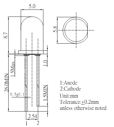 LUCKY LIGHT Manufacturer part number: 503AD2E-2B RoHS Case style: Rys.OLO.5m0350 |