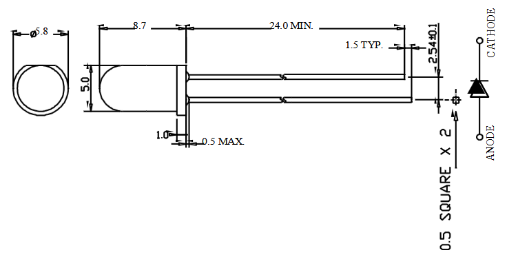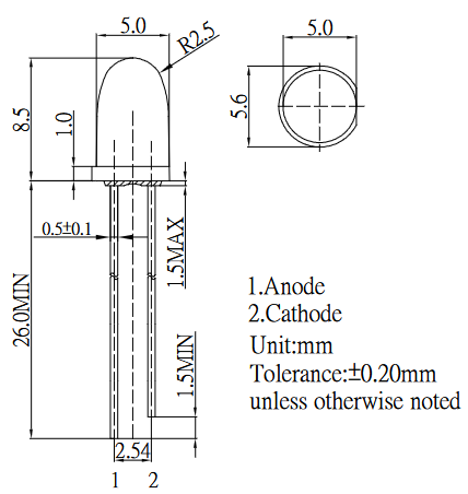 Red | 80~100mcd | 30mA | 50° | 1,8~2,2V | 660nm | -40°C ~ 85°C | THT | 5mm | |||||||||||||||