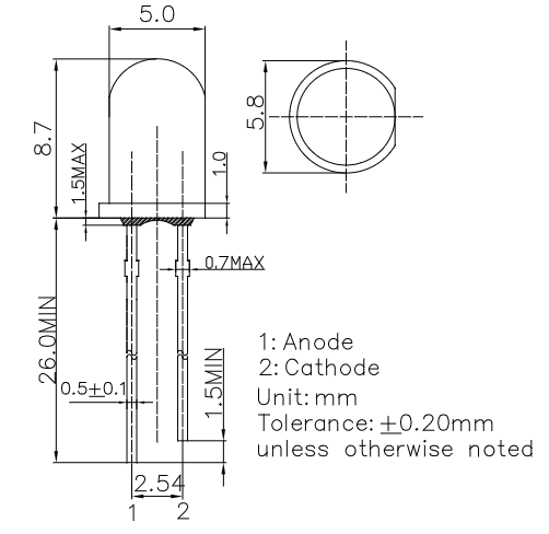 | Red/Yellow-Green | 630~650/560~580nm | 20mcd | 30mA | 40° | 2,0~2,4V | -25°C ~ 85°C | THT | 5mm | ||||||||||||||||||||