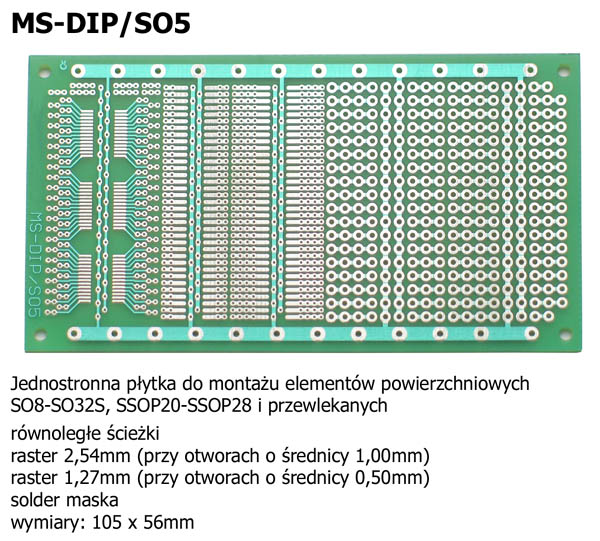 Universal PCB, single-sided for mounting SMD SO8-SO32S, SSOP20-SSOP28. Hole diameter 1,0mm; pitch 2,54mm; 0,5mm; pitch 1,27mm; dimensions 105x56mm.