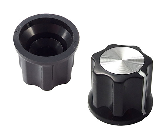 Knob for potentiometers; dimensions: 14x17mm; shaft diameter: 6mm; black; colour pointer: silver; cap colour: silver; with flange; material: aluminum + ABS