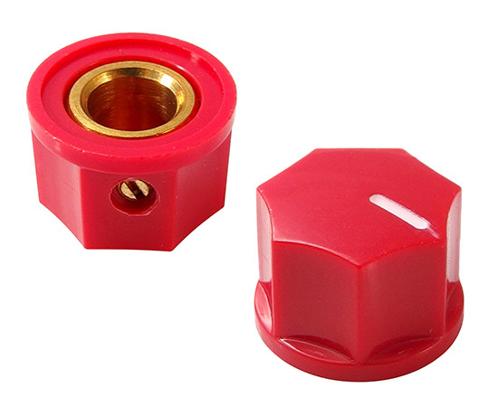 Knob for potentiometers; dimensions: 10,5x15mm; shaft diameter: 6,35mm; red; colour pointer: white; with flange; material: copper + bakelite