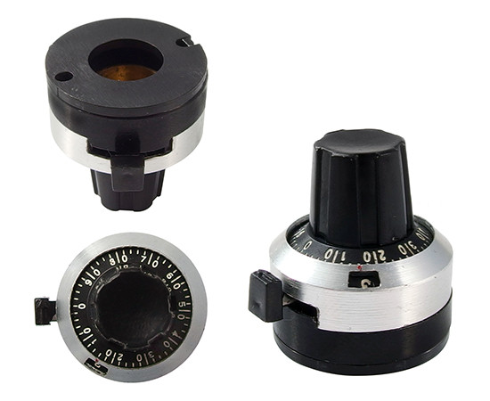 Knob for potentiometers; dimensions: 24x22mm; shaft diameter: 6,35mm; black; with counting dial; material: copper + aluminum + ABS