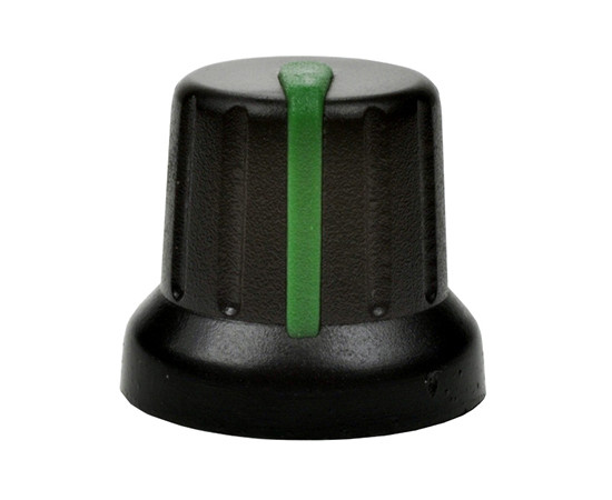 Knob for potentiometers; dimensions: 16/12x14mm; shaft diameter: 6mm; black; colour pointer: green; material: plastic