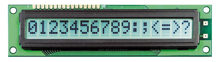 LCD character display 16x1 chars size 122.0x33.0x13.0mm viewing area 99.0x13.0mm backlight color green, grey chars, temp. range -20°C~+70°C