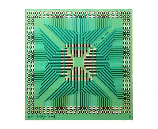 Universal PCB, single-sided for mounting SMD QFP48-QFP144 witch 0,5mm. Hole diameter 1,0mm; pitch 2,54mm; dimensions 71x73,5mm.
