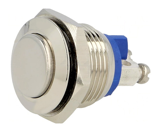 16mm; momentary; OFF-(ON); SPST-NO;nickel plated brass; silver; screw terminals protruding button; 2A; 36VDC; IP65; lifetime: 1000000 cycles