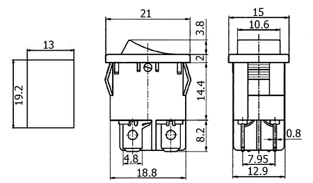 2 stable positions; ON-OFF; rocker red illumination; housing colour: black; DPST; 4P; 10A 125V; 6A 250V; endurance: 10000 cycles; operating temperature: -25°C+85°C