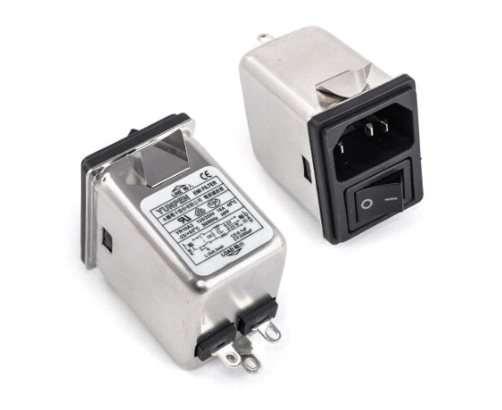 Male socket IEC for panel with filter and switch, latch, soldering IEC C14, 10A/250VAC, Cx 100nF, Cy 3.3nF