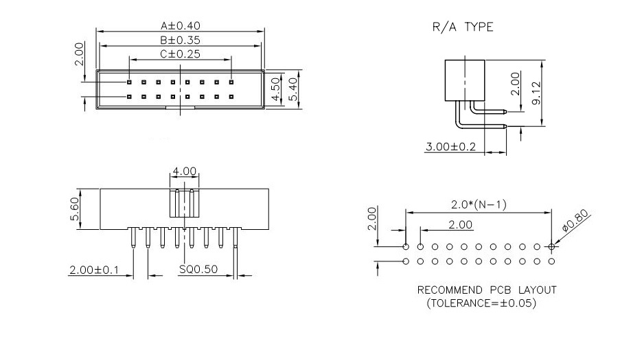 Male 16pin pitch 2.00mm IDC for PCB angled, black color built-up eqiv. BHM-16R