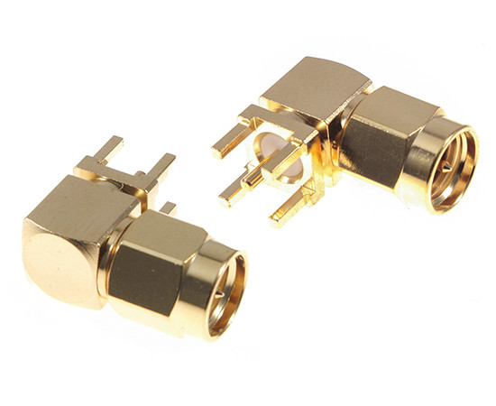 Right Angle SMA Male, THT, 50 Ohm, teflon insulator, body and shell material: brass gold plated
