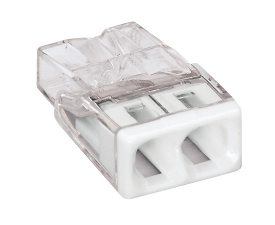 Compact push-wire connector for junction boxes; 2-conductor terminal block; Transparent housing; White cover; 24A; 450V;