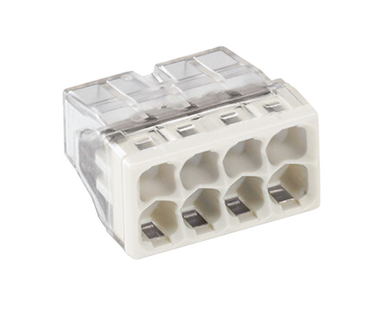 Compact push-wire connector for junction boxes; 8-conductor terminal block; Transparent housing; Light grey cover; 24A; 450V;