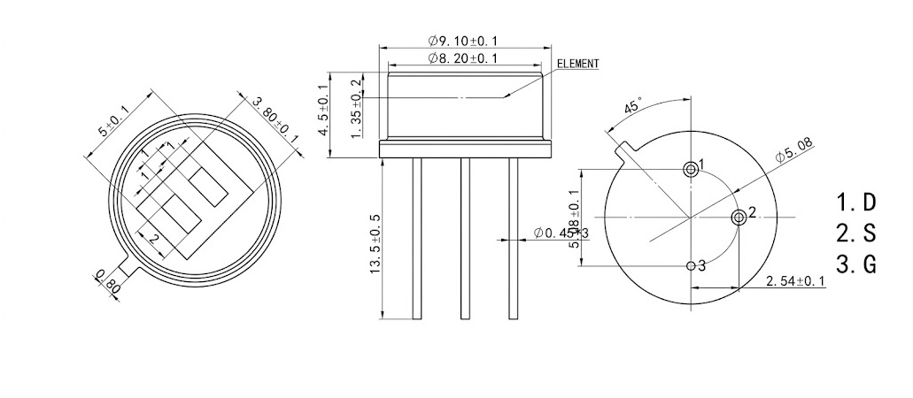 2~10V; 95°x87°; analog output; TO-5; metal housing; dimensions: 8,1x4,2mm; operating temperature: -40°C ~70°C