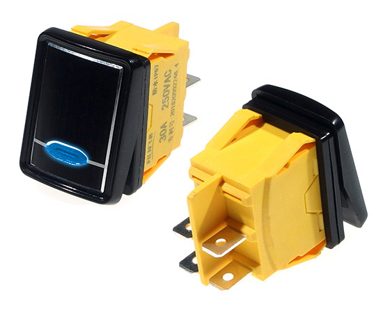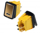 2 stable positions; ON-OFF; rocker white illumination; housing colour: yellow; IP68; 4 wires 20cm; 20A 125VAC; endurance: 20000 cycles; operating temperature: -25°C+85°C