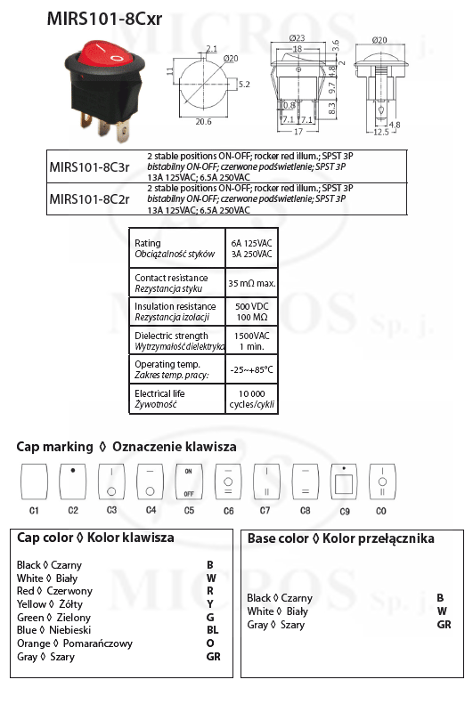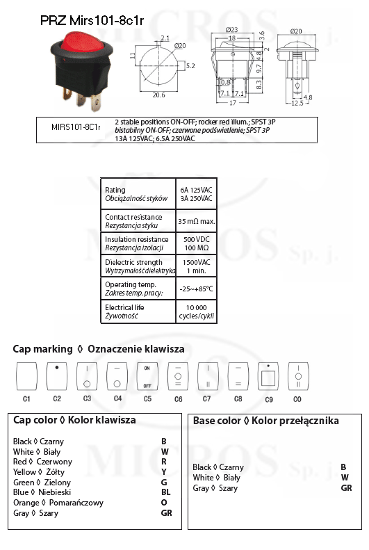 6A; 250VAC; 2 stable positions; ON-OFF; housing colour: black; SPST; 3P; white lamp; endurance: 10000 cycles; operating temperature: -25°C+85°C