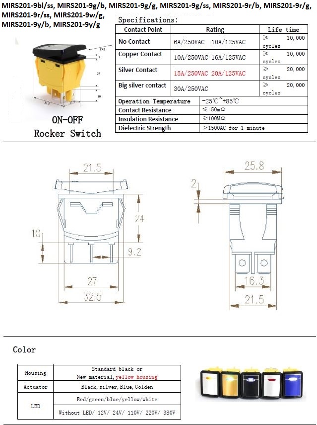DPST | Red | ON-OFF | 20A 125V 16A 250V | Black | Yellow | Wires | N/A | Button | N/A | -25°C ~ 85°C | ||||||||||||