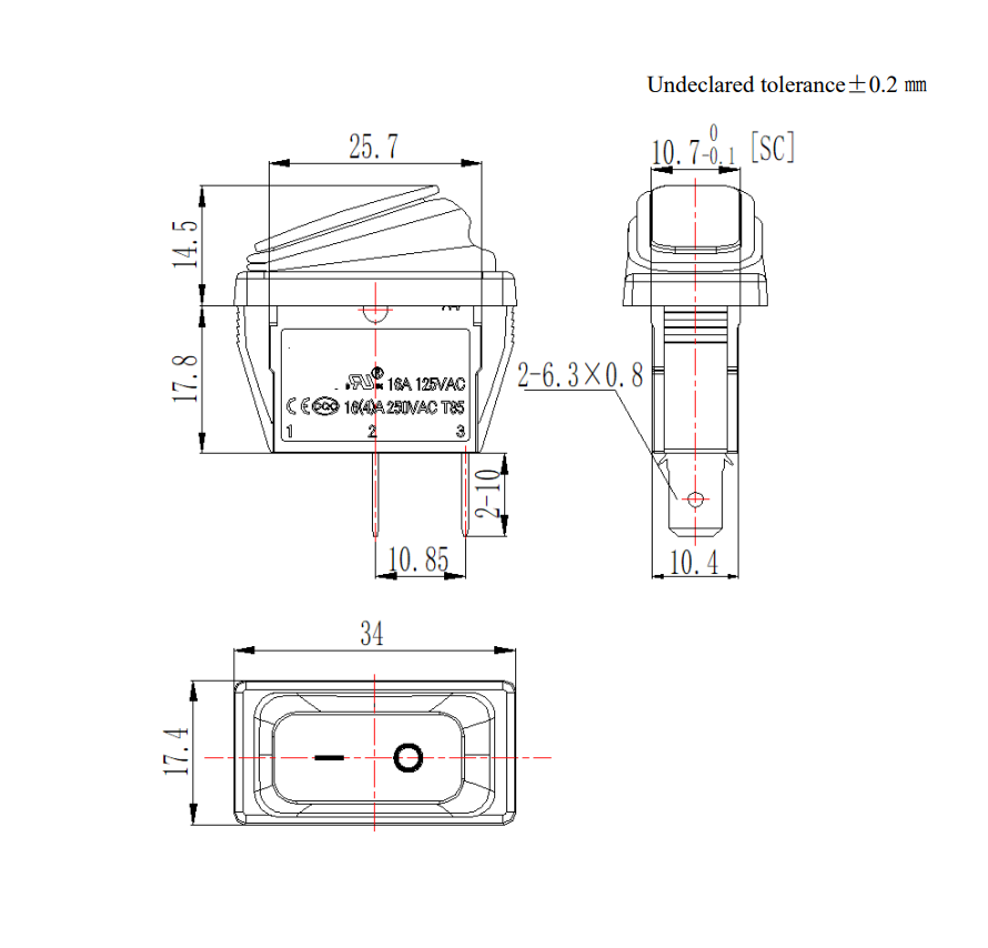 2 stable positions; ON-ON; cap colour: red; housing colour: black; SP-DT; 16A 250VAC; endurance: 10000 cycles; operating temperature: -25°C+85°C