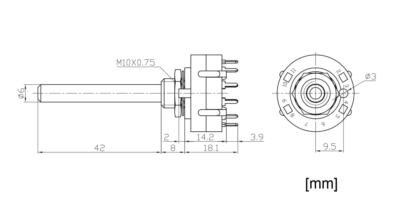 Rotary switch; stable positions: 12x30°, shaft diameter 6mm, shaft length 50mm, thread M10x0,75 PCB; switching torque 8.6Ncm; switching method BBM (non-shorting)