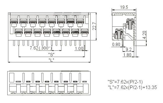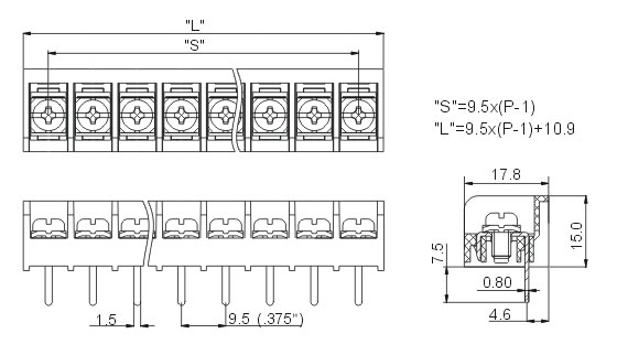 10 poles, pitch 9.52mm, height 19.8mm, black color 450V, 24A, 22-14AWG, 2.5mm2, PA66, UL94V-0, M3.5