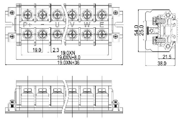 9 poles, pitch 19.0mm, height 54.0mm, black color 600V, 65A, 20-6AWG, 14.0mm2, PC, UL94V-0, M6