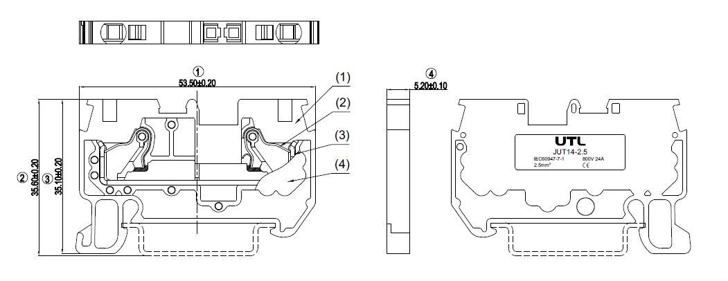 600V, 20A, wire size 0.2-4mm (UL), gray color Thick/Width/End plate: 5.2/48.5/2.2mm