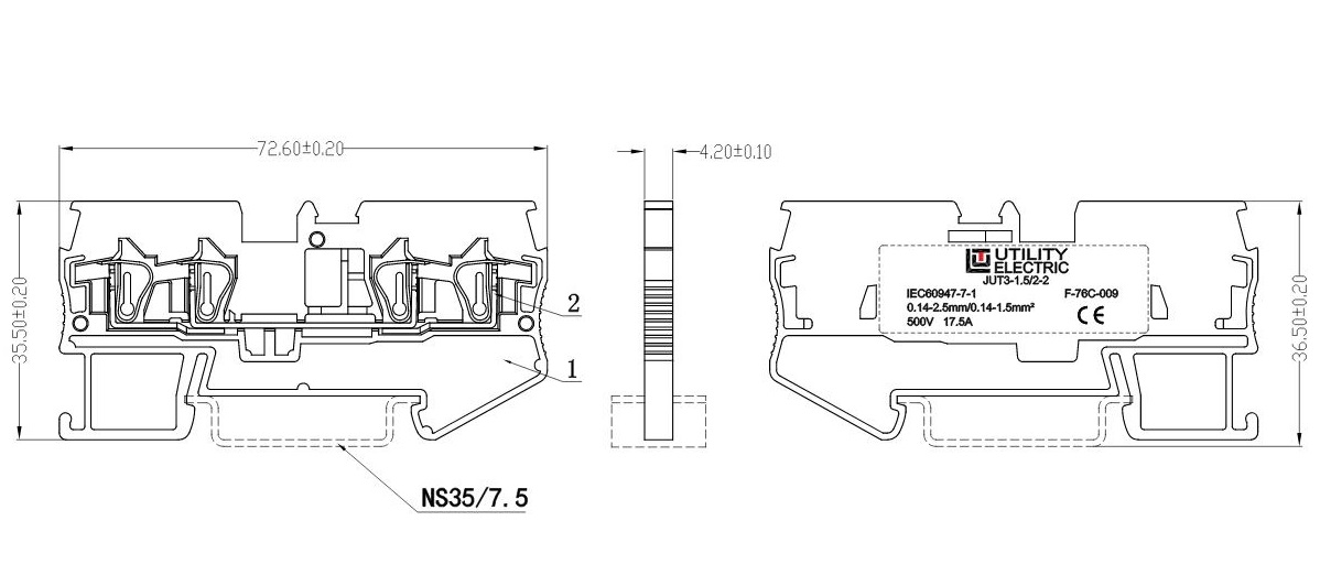 Din Rail Terminal Block, 500V, 17.5A, wire range: 24-16 AWG, gray color L/H/W, (60.8/35.5/4.2mm), material: PA66 UL94 V-0