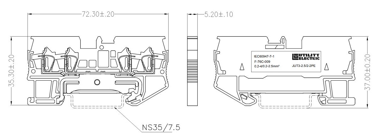 Din Rail Terminal Block, 800V, 24A, wire range: 24-14 AWG, yellow-green color L/H/W, (72.3/35.3/5.2mm), material: PA66 UL94 V-0