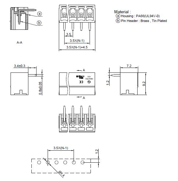 4 poles; pitch: 3.5mm; height: 7.2mm; green color, 300V; 8A, angled, mates with TLPS001 / TLPSZ001 3.5mm solder pin: brass, tin plated; eqiv. MC 1,5/ 4-G-3,5; 1844236; 15EDGRC-3.5-04P