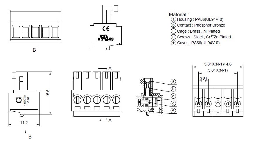 5 poles;pitch: 3.81mm;height: 15.6mm; green color,clamp:phosphor bronze,tin plated, 300V; 8A, 28-16AWG; mates with TLPHC100 3.81mm wire cage: brass,nickel plated; screw: steel; zinc plated; eqiv. MC 1,5/ 5-ST-3,81; 1803604; 15EDGK-3.81-05P