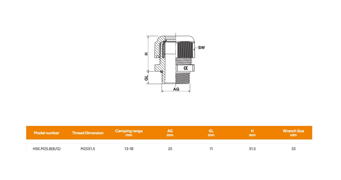 gwint: M25; długość gwintu: 11mm; skok gwintu: 1,5; średnica zewnętrzna przewodu: 9..16mm; kolor szary (RAL7037); H: 31,5mm; rozmiar klucza: 33mm; materiał: PA; UL94-V2; klasa szczelności: IP68