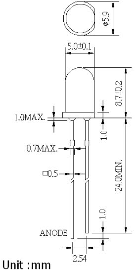 LED THT; czerwony; jasność: 250-600mcd; kąt świecenia: 45°; prąd diody: 20mA Długość fali: 620-630m; dyfuzyjna; Napięcie pracy: 1,8-2,6V